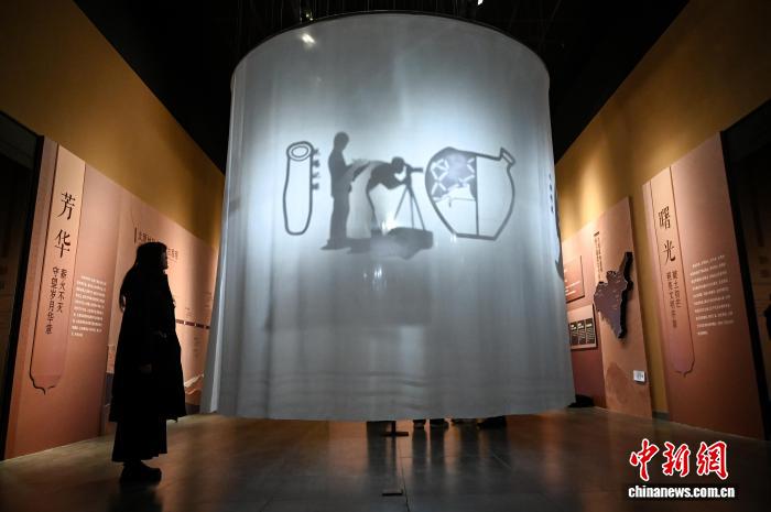 今日山西太本晋阳古乡考古专物馆,公众观光镇乡遗迹彩陶罐。中新社记者 韦明 摄